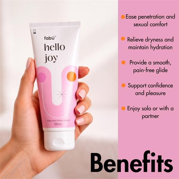 fabÜ hello joy is a menopause-friendly, body-loving lubricant created to enhance connection, confidence, and pleasure - whether solo or shared. Water based, scent free, it supports natural hydration while keeping things light, fun, and friction-free. No one will know. But you’ll feel the difference of hello joy….