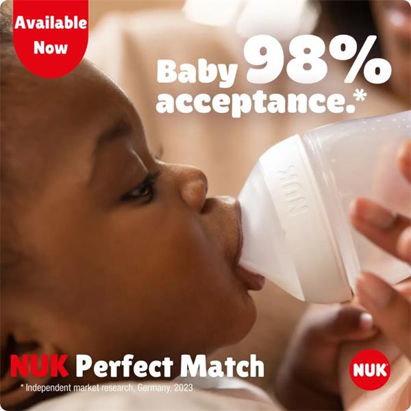 • Midwife recommended: 96% of midwives endorse the NUK Perfect Match bottle**, equipped with a patented Temperature Control indicator and BPA-free materials.