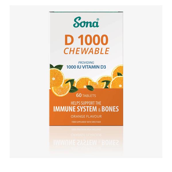 SONA D 1000 CHEWABLE provides 1000 IU Vitamin D3 in a delicious tasting orange flavoured chewable tablet. Vitamin D3 is important for the maintenance of normal bones and teeth, cell division and normal muscle function. It is also required for the absorption and utilisation of calcium and phosphorus, the normal function of the immune system and inflammation response.