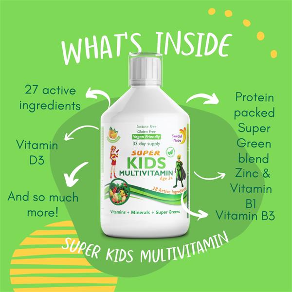Swedish Nutra Super Kids is a premium liquid multivitamin specially formulated for children's growth and development. Packed with essential vitamins, minerals, and super greens, this supplement provides a comprehensive boost to your child's immune system, energy levels, and overall health.